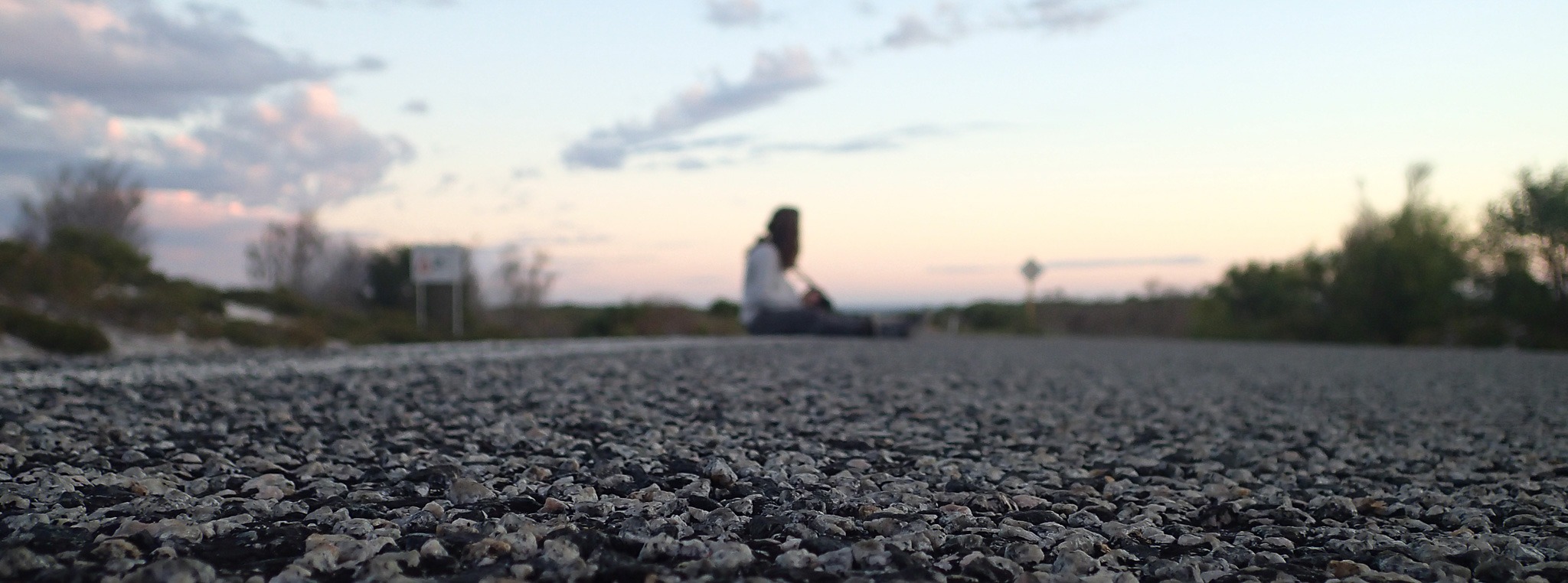 The camera focuses on rough asphalt in the foreground, while a person sits cross-legged and out of focus on a deserted road, with a pastel sky and scattered clouds at sunset in the background. The photo creates a sense of solitude and contemplation.